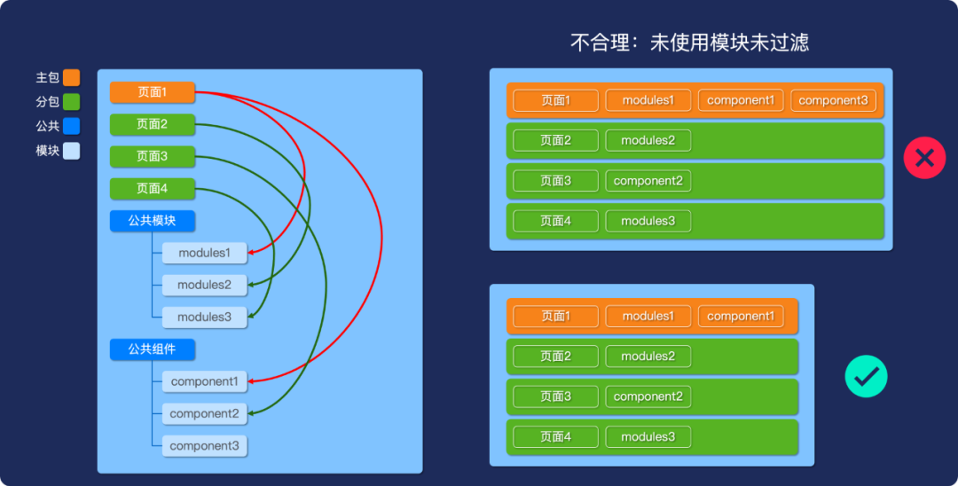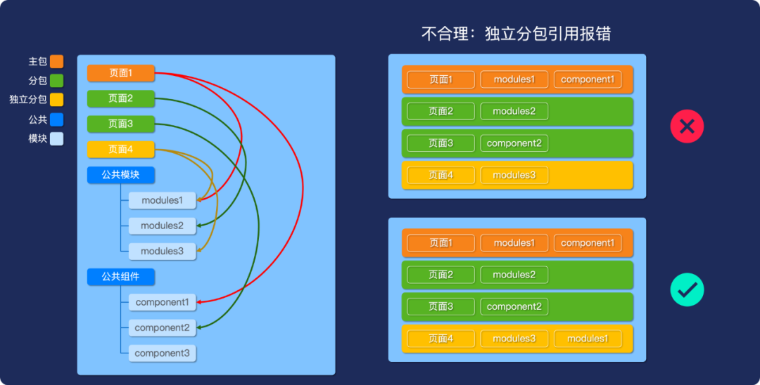 另外,如果某一个分包与主包引用了同一个模块,这时候将这个模块计算到主包中是 OK 的,但如果这个分包是一个独立分包的情况下,再去引用主包的模块,是有可能报错的。上面这种情况需要通过构建的方式将模块复制一份放到独立分包下面才能保证小程序的正确执行。