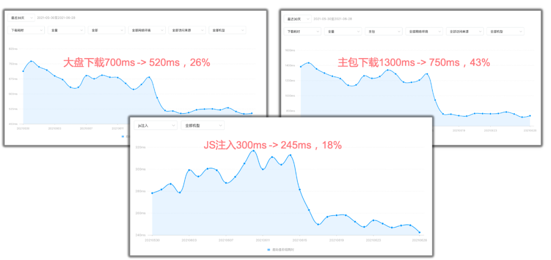 我们的优化在实际的启动耗时上也有比较显著的效果,主包下载耗时优化了 43%,js 的注入耗时优化了 18%。