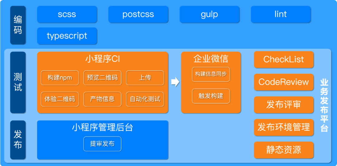 为了解决发布流程不规范的问题,我们将小程序的发布也接入到了业务发布平台。在发布平台上进行 CheckList、CodeReview、发布评审、发布环境管理、发布静态资源等流程的流转,确保需求发布的质量、合规和有序。