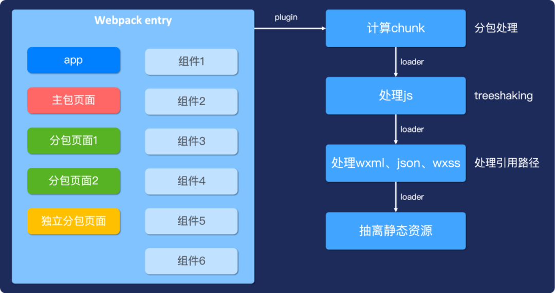 以 app.js 作为入口文件,根据小程序的配置规则找到对应的 json 文件,逐层递归就可以将整个小程序所使用到的页面和组件分析出来,并将所有的页面和组件都作为 webpack 的 entry,就可以获取到小程序中 js 模块的引用信息了。