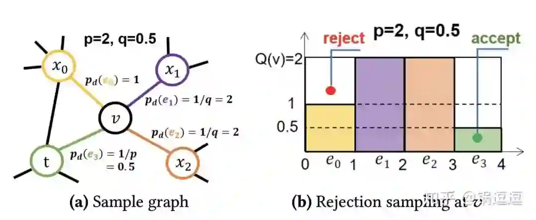 当采样概率小于Tmin时,不管当前采样节点和上一跳节点的关系如何,都可以直接接受该节点(图(c)),算是一种预处理的trick。