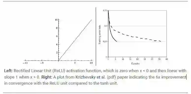 但tanh和sigmoid函数都在优化中存在一个比较严重的问题:函数值x对应的梯度在0附近较大。当x值较大或较小时,对应的梯度则会相对较小。当数值落在这些区域时模型会变得很难优化。一种解决方式是采用ReLU作为激活函数,ReLU函数的形式为max{0,x},将输出强制为非负形式,并不对输出做smooth化。对比sigmoid、tanh和ReLU函数曲线的表现形式上来看,在ReLU函数上计算所得的梯度会较其他两种激活函数更大,不会因为陷入某些局部解而使得模型难以优化。Krizhevsky等人对比ReLU和tanh激活函数,展示了两者作为激活函数的收敛速度,可以看到两者收敛速度的差别(见图 7)[1]。但在RNN中选用ReLU替代tanh作为激活函数的问题是对模型的参数调整要更为小心,一旦学习率过大,则很有可能导致神经元中大量的连接不再起作用,从而导致模型的整体性能下降。