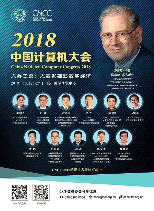 CNCC 2018 将邀请业界知名学者进行特邀报告演讲,届时 CCF 名誉理事、CCF 会士、中国工程院院士李国杰将围绕「大数据推动数字经济」这一话题对大数据发展现状和趋势及其对经济社会发展的影响展开演讲,同时对中国产业经济现状及未来发展给出合理化建议。另外2004年图灵奖获得者、TCP/IP 协议合作发明者、互联网雏形 Arpanet 网络系统设计者 Robert E. Kahn ,CCF 副理事长、南京大学教授、中国科学院院士吕建,新加坡国立大学杰出教授、新加坡科学院院士、ACM/IEEE Fellow 黄铭钧,Google 中日韩文搜索算法的主要设计者、博士吴军,加拿大工程院院士、加拿大西安大略大学终身教授凌晓峰,2018 CCF 青年「两秀讲者」陈海波、孙晓明等也将进行特邀报告演讲。