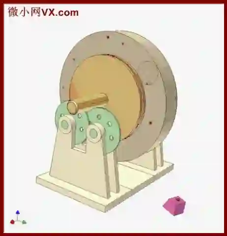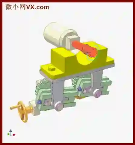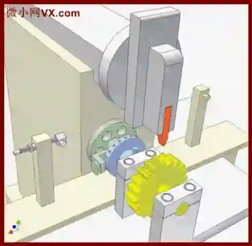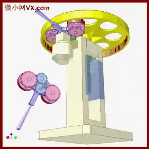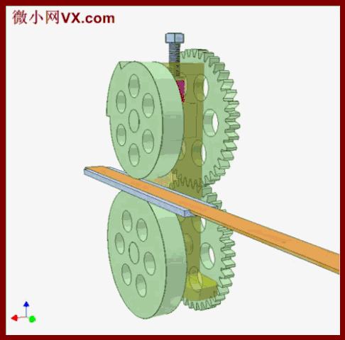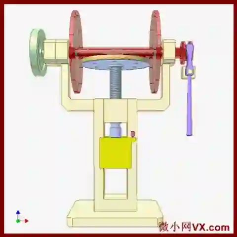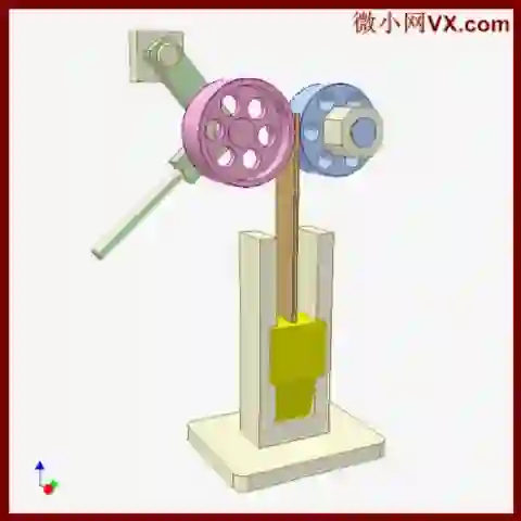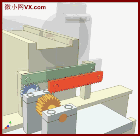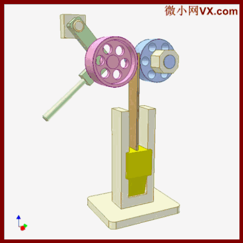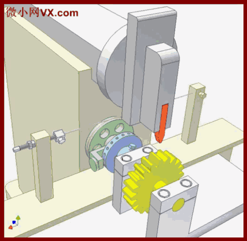 其上固定一个齿轮和一个不完整辊柱的上绿色轴可以在黄色基座上的垂直槽中滑动。