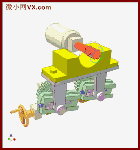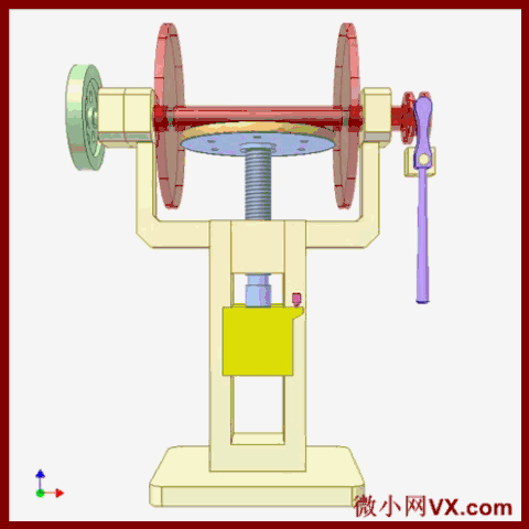 红色工具固定在粉色螺母滑块上,有小螺距的螺旋运动。