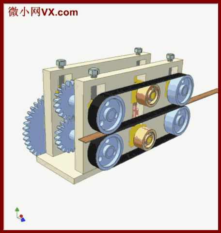 皮带预紧器包括两个橙色辊柱和一个在末端有左螺旋和右螺旋的粉色螺钉。