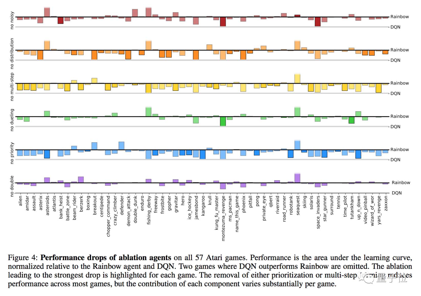 DeepMind在arcade环境中,用57款雅达利2600游戏包括对原始DQN、DDQN、Prioritized DDQN、Dueling DDQN、A3C、Distributional DQN、Noisy DQN,以及Rainbow在内的所有agent进行了测试。