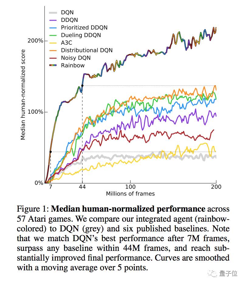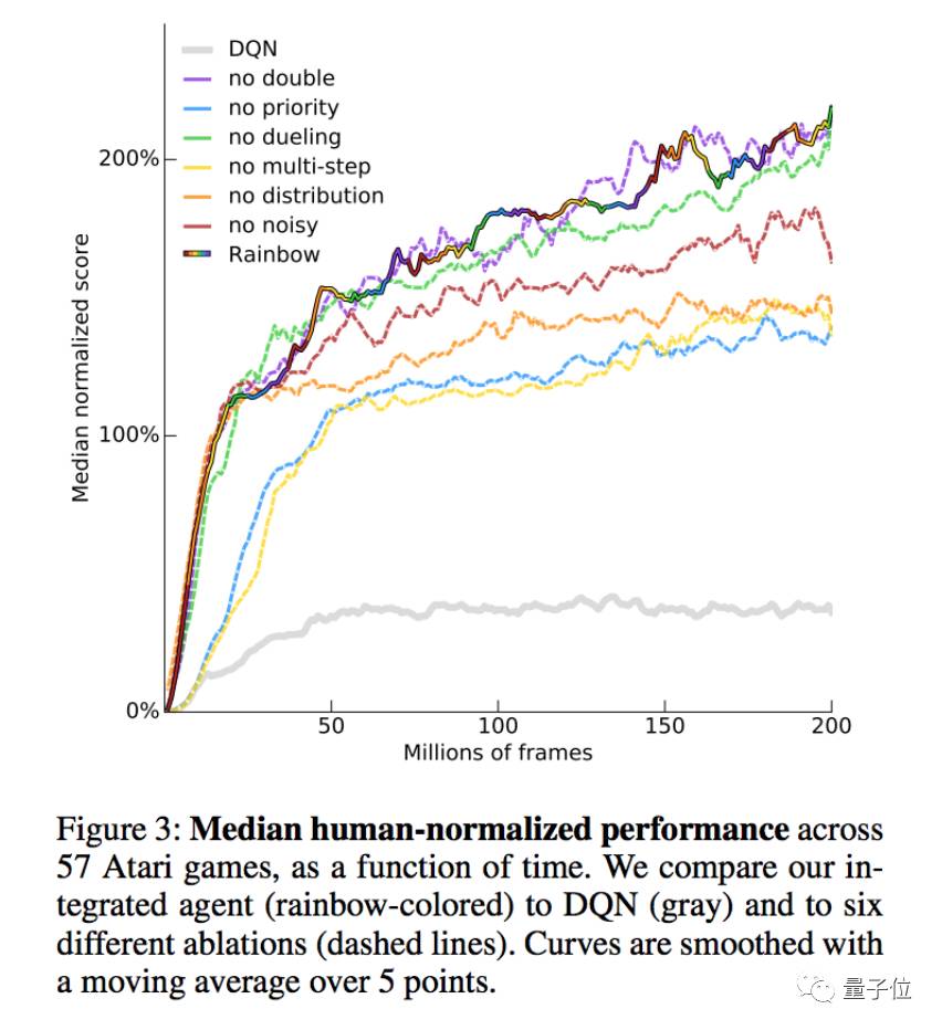 上图中彩虹色的是混血Rainbow,灰色的是原味DQN。横轴表示训练用的帧数,纵轴表示算法在雅达利游戏上的“人类标准中位得分”,也就是agent的得分与中等水平的人类相比,是百分之多少。