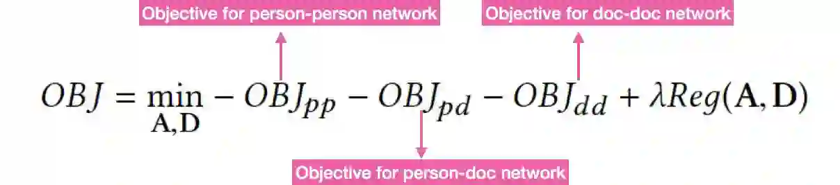 基本假设:存在LINK的节点间Embedding距离 < 无LINK的节点间Embedding距离,定义异构网络的LOSS,计算梯度迭代求解,得到“Document”的embedding后聚类。