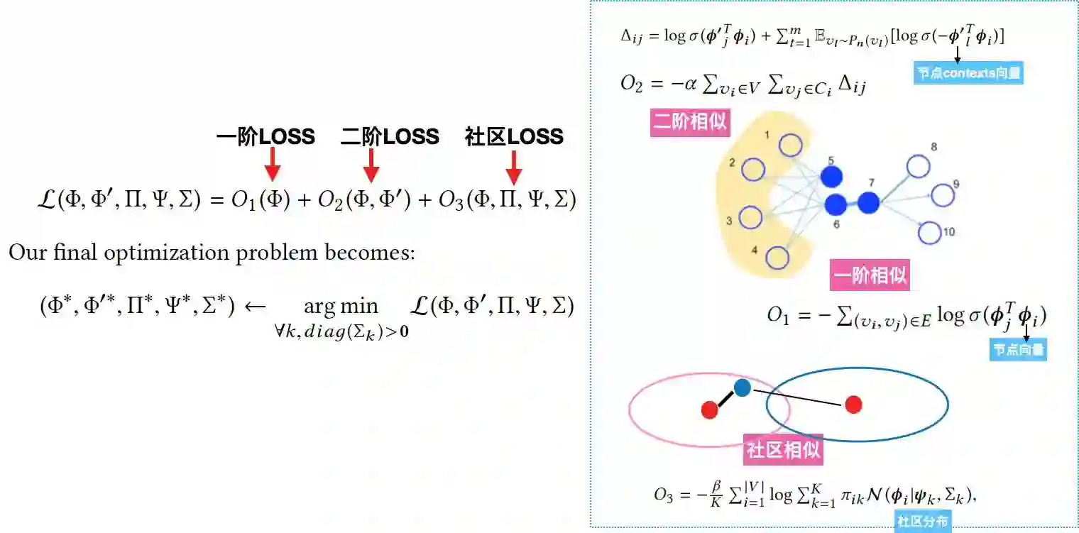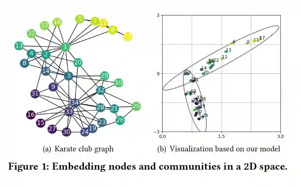 解读:community embedding,网络社区结构的向量表达,通常是其节点集合的向量分布(多元高斯分布)。基本假设:节点embedding,与其所在社区的中心节点相似度高,这个假设约束有助于Node Embedding更好的引入网络高阶信息,进而更好的支持community detection。当前,community embedding, community detection and node embedding这3大任务通常都作为独立的问题去解,本文提出一个闭环算法结构,算法的输出同时包含节点向量、社区向量以及最优社区结构划分。