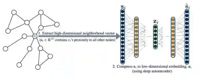 主要思想:将节点的相似性向量 s~i~直接作为模型的输入,通过 Auto-encoder 对这个向量进行降维压缩,得到其向量化后的结果 z~i~。