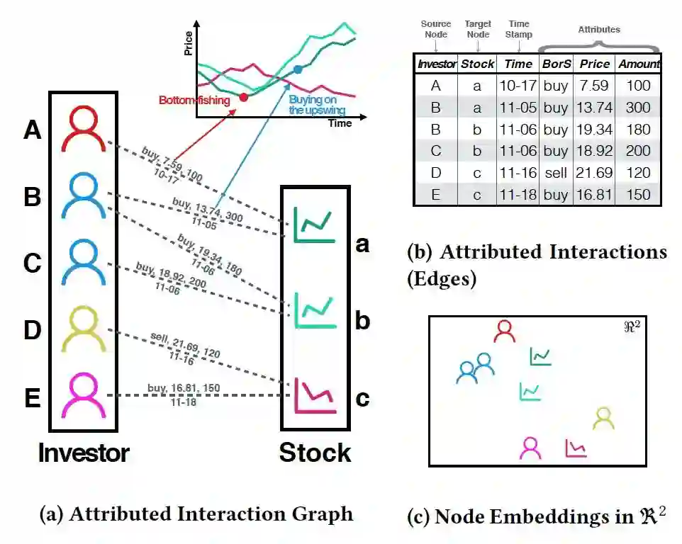 解读:网络构成中,边上带了很丰富的交互信息,如何同时利用这部分信息进行节点Embedding。比如“用户”-“股票“之间的交易网络,边上带有丰富的“时间、价格、数量”特征,如何结合这些信息和网络结构,得到“用户”、“股票”的embedding向量,进而用于预测“用户”后续会买哪只股票。