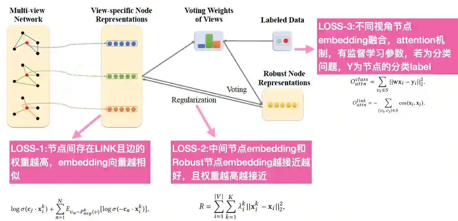 解读:区分网络多种构成方式,比如:社交关联、资金转账网、属性相似性网等,从不同的视角分别做节点embedding,再基于Attention机制融合不同的embedding结果。整体框架如下图: