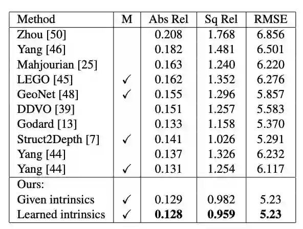 表1:总结了在KITTI上训练的模型和评估结果,使用给定相机内建和学习相机内建两种方式来评估我们方法的深度估计,结果显而易见,我们获得了当前最佳SOTA。