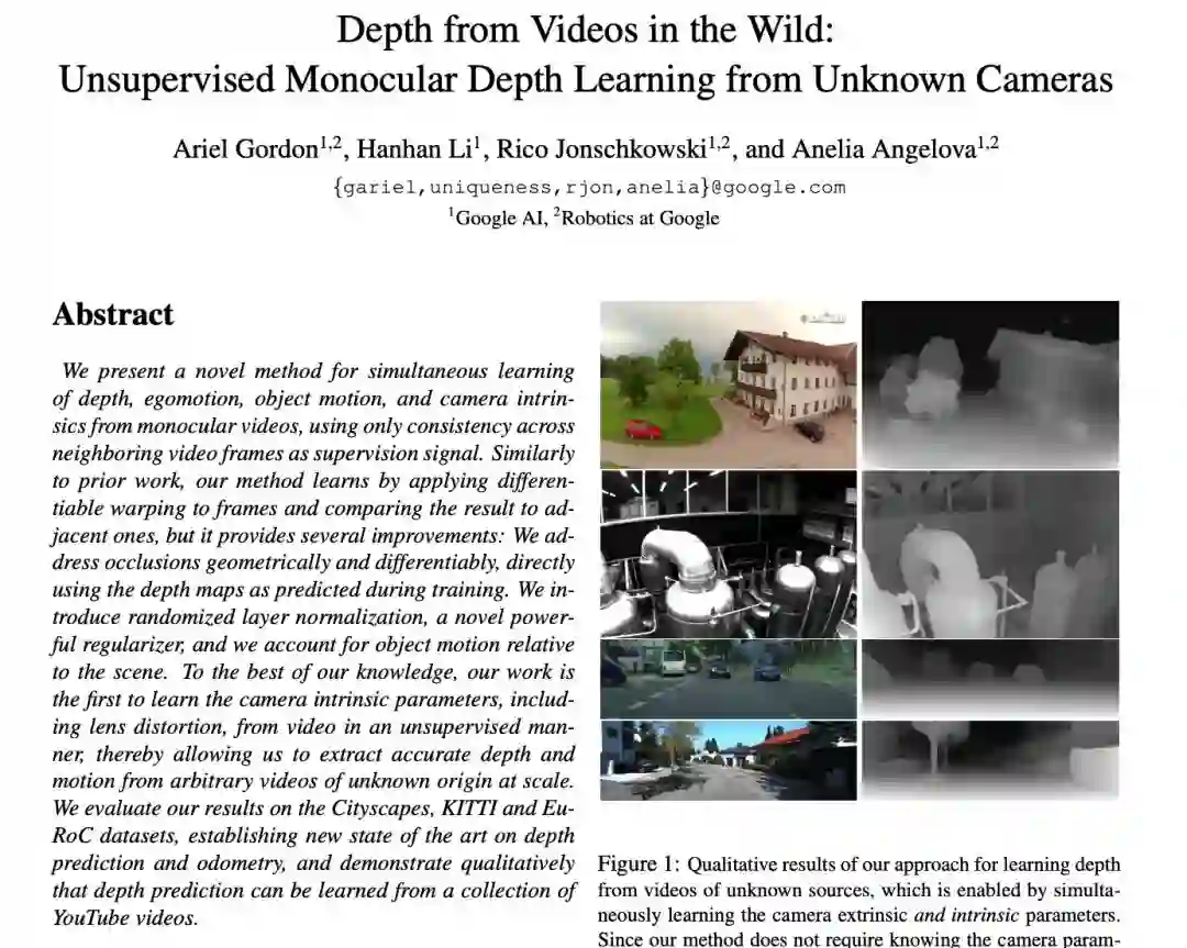 图1:从未知来源的视频中学习深度的方法的定性结果,通过同时学习相机的外在和内在参数来实现。由于该方法不需要知道相机参数,因此它可以应用于任何视频集。所有深度图(在右侧可视化,作为差异)都是从原始视频中学习而不使用任何相机内在函数。从上到下:来自YouTube8M的帧,来自EuRoC MAV数据集,来自Cityscapes和来自KITTI的帧。