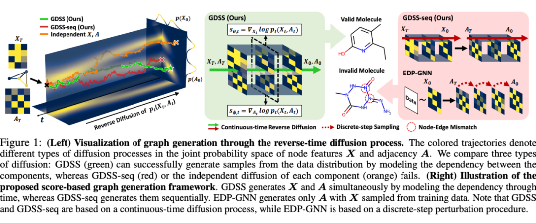 Jo,Lee 和 Hwang 提出了解决二维图生成的 Graph Diffusion via the System of Stochastic Differential Equations(GDSS) [14] 。前面提到的 EDM 是一种 denoising diffusion probabilistic model(DDPM),GDSS 则属于 DDPM 的一个近亲,score-based model。前不久 ICLR’21 的工作  [15]  得出一个结论,如果我们把正向的 diffusion 过程用随机微分方程(SDE)解释的话,DDPM 和 score-based model 是可以统一为一个框架的。
