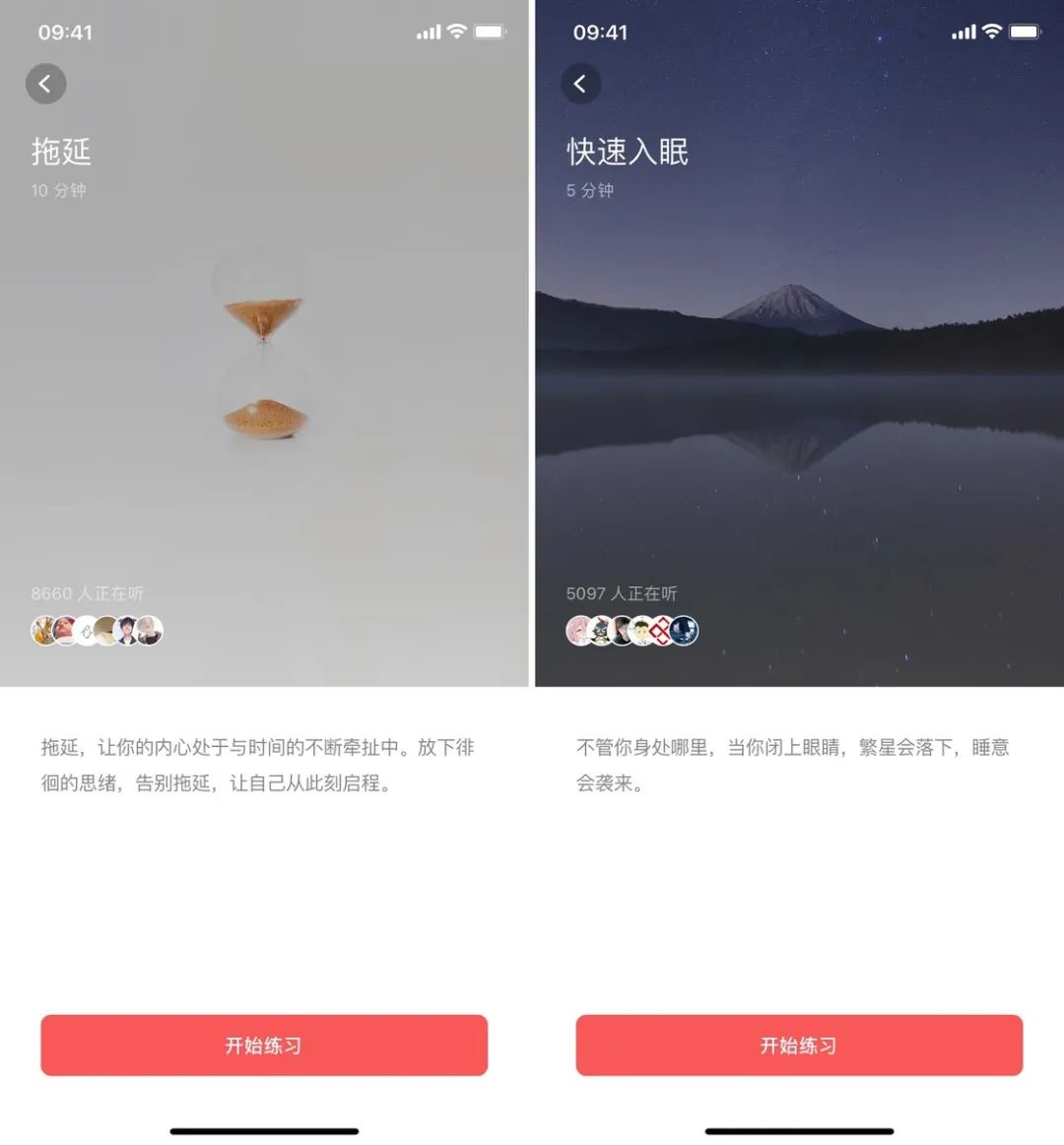 在大多数的练习课程中,潮汐都会为你规定一个场景,并引导你通过想象、调整呼吸来放松自己,进入状态。比如「拖延」练习中,应用会逐步引导你直面那些束缚着你的想法,帮你改善拖延症。