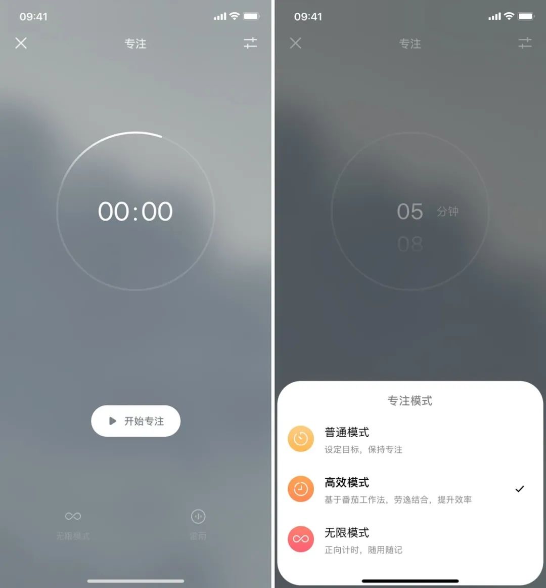 以我个人为例,我很喜欢在「无限模式」下听着白噪音来看书或写作。在专注前,我还会进行一次「阅读前」或「专注」的冥想练习,帮助我更快进入那个只有自己和文字的世界,提升阅读或写作的专注度。