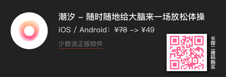 目前,潮汐已上架少数派正版软件商城,少数派读者可享 1 月/ 3 月 / 1 年会员的特惠价格,售价分别为 ¥15 / ¥49 / ¥199,你可以长按二维码进行购买。