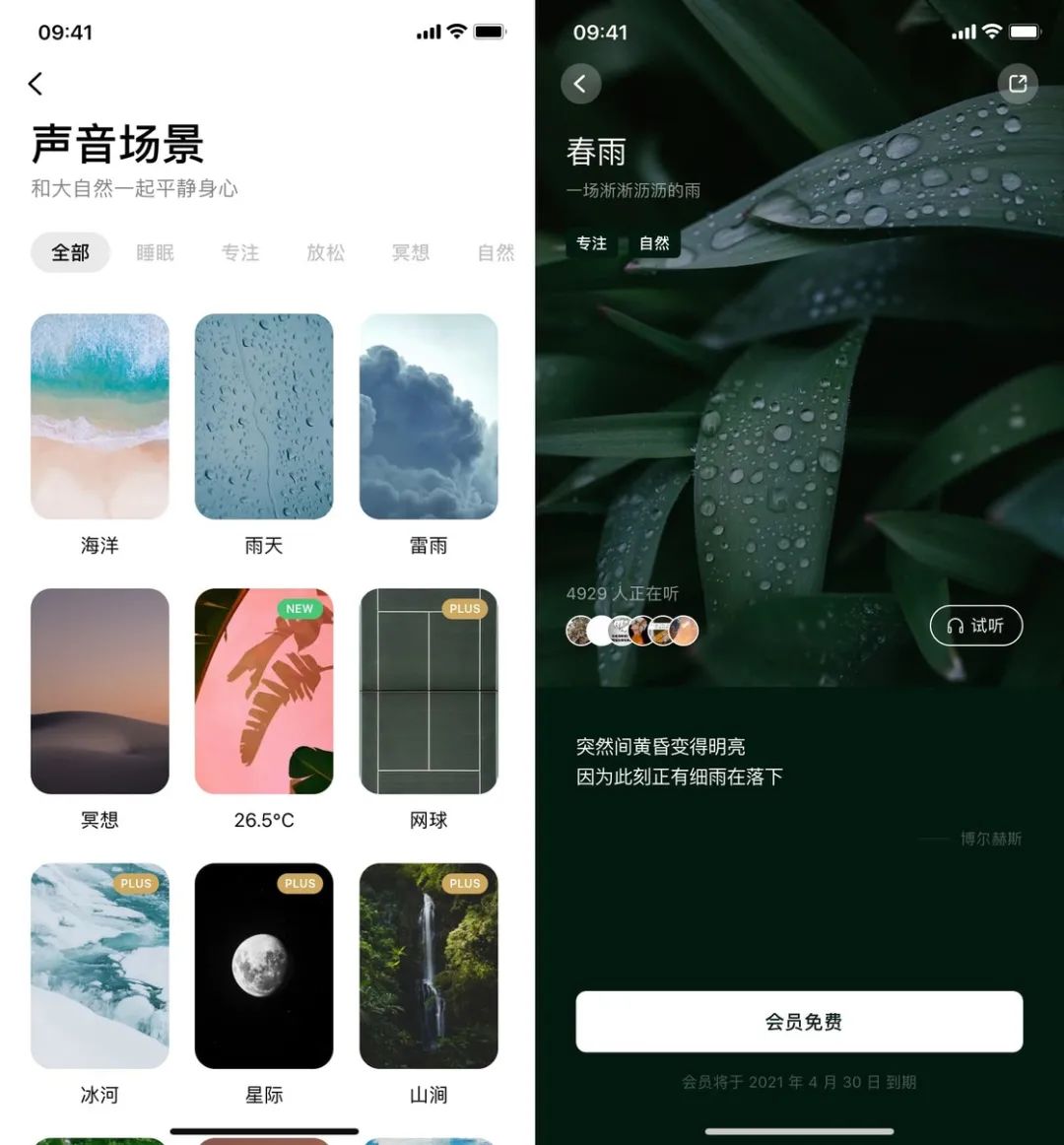 如果你想解锁更多声音,还可以选择订阅「声音卡」或 Plus 会员,两者主要的差别在于「声音卡」只可以解锁白噪音里的会员素材,而 Plus 会员还能解锁冥想练习、轻唤醒铃声等更多内容。