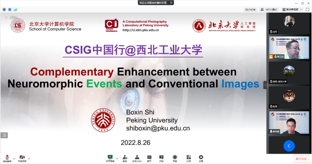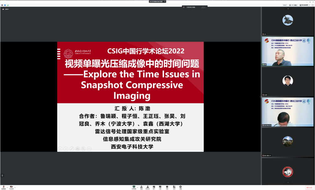 西北工业大学戴玉超教授主持会议,西北工业大学电子信息学院院长王伶教授致欢迎辞,CSIG机器视觉专委会主任林宙辰教授代表学会及专委会致辞,西北工业大学电子信息学院何明一教授代表陕西省信息获取与处理重点实验室致辞。西安电子科技大学陈渤教授、国立清华大学林嘉文教授、北京大学施柏鑫研究员、湖南大学周易教授和日本东京大学郑银强教授受邀作报告,本次会议交流主题为“面向非常规相机的视觉感知”,得到了广泛关注,吸引了来自多所高校200余位师生在线参会。