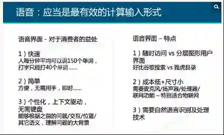 当然,最关键的一点的还是交互方式的变革——从DOS到Windows,从命令代码到图形化操作是用户体验的一次飞跃;从按键到触屏,向人类自然操作方式更近了一步;现在,语音正在成为一种更加顺应人性的自然交互方式。