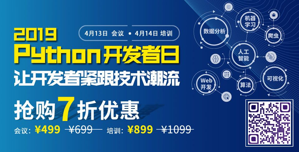 「2019 Python开发者日」7折票限时开售!这一次我们依然“只讲技术,拒绝空谈”,除了10余位一线Python技术专家的演讲外 ,大会还安排了深度培训实操环节,为开发者们带来更多深度实战的机会。扫描海报二维码,即刻抢购7折票!