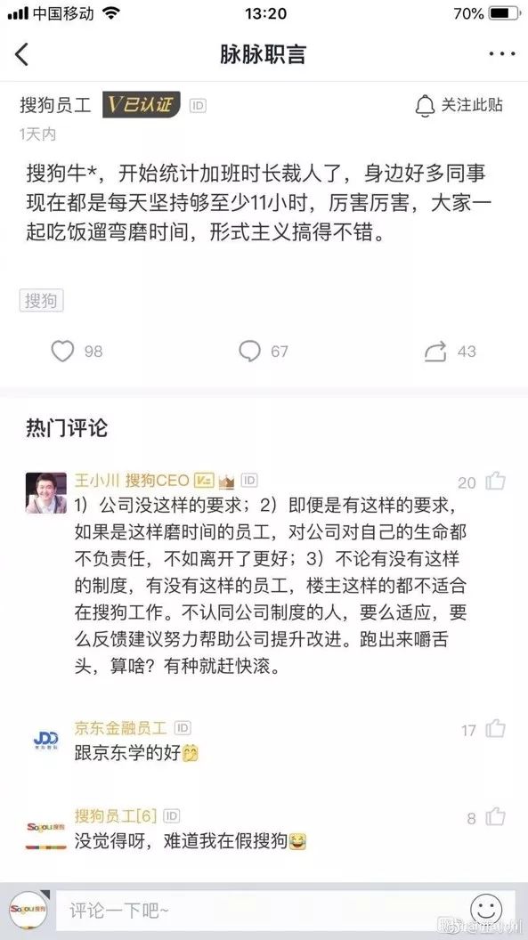 王小川在脉脉里“怼”起了抱怨公司统计加班时长的员工,这位员工的抱怨中提到,他身边的搜狗员工,“最近每天坚持工作11小时,大家一起吃饭遛弯磨时间”。