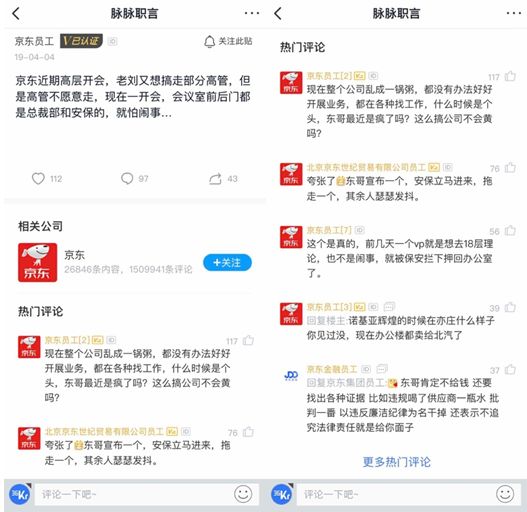 近日,脉脉有人爆料,帖子的内容大概是,刘强东近期在高层会议中,想要清退部分高管,但高管并不愿意走,现在开会,会议前后门都是总裁部和安保的。这位员工的ID得到了APP的认证。