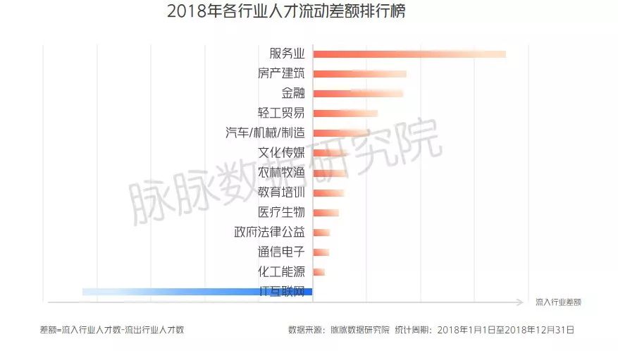 在脉脉数据研究院《2019春招季人才市场趋势报告》中,与2018年秋招季相比,互联网行业是唯一一个人才就业竞争度上升的行业,而IT互联网也是唯一一个人才流动差额为负的行业。