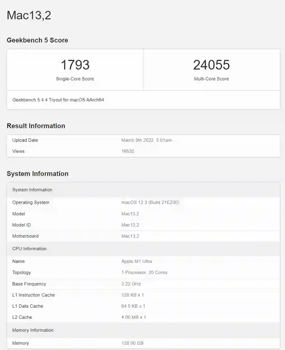 从 Geekbench 网站上的 M1 Ultra 跑分成绩来看,在 Geekbench 5 基准测试下,单核跑分为 1793,多核跑分为 24055。