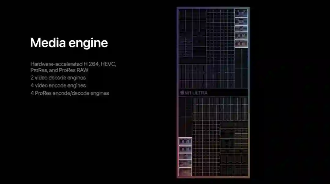 M1 Ultra 的媒体引擎性能是 M1 Max 的两倍,提供了前所未有的 ProRes 视频编解码吞吐量。事实上,搭载了 M1 Ultra 的 Mac Studio 最多可以播放 18 条 8K ProRes 422 视频流,这是其他芯片无法做到的。