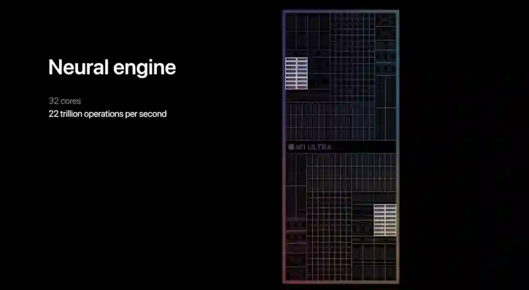 M1 Ultra 具有 32 核神经网络引擎,每秒运行高达 22 万亿次运算,可以加速完成最具挑战性的机器学习任务。