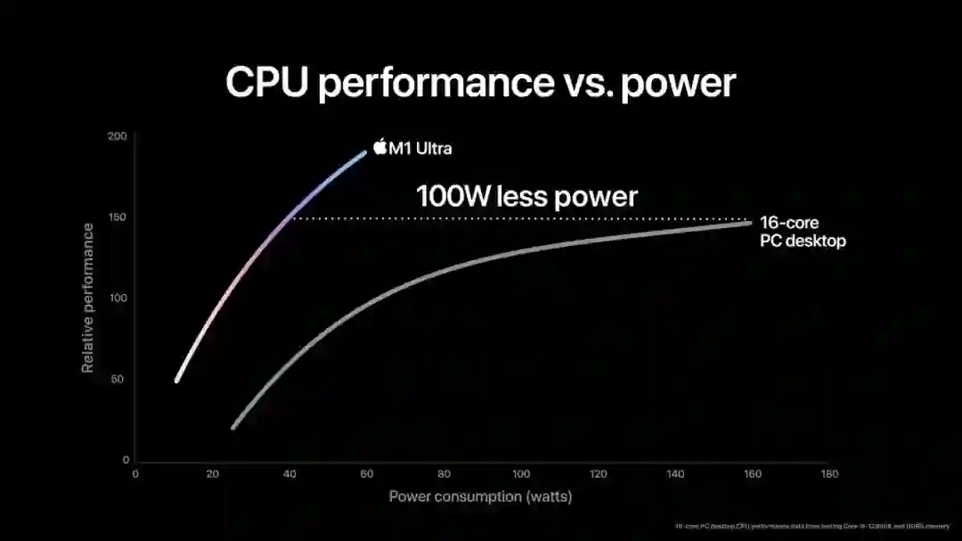 此外,M1 Ultra 用比英特尔酷睿 i9 12900K 少 100 瓦的功耗,达到了当今 PC 芯片的最高性能。这种惊人的效率意味着它耗能更好且风扇能够安静地运行。