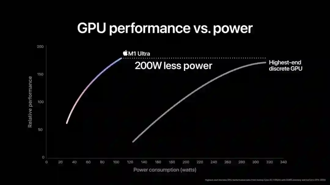 对于大多数图形密集型需求,如 3D 渲染和复杂的图像处理,M1 Ultra 拥有 64 核 GPU,是 M1 的 8 倍。和 X86 的机器对比的话,获得和 RTX 3060Ti 相同的算力只需 1/3 功耗。和最高端的台式机 GPU RTX 3090 比,性能更高,功耗还少 200 瓦。