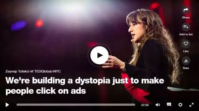 在一场令人大开眼界的演讲中,她详细介绍了Facebook、Google和Amazon这样的算法公司是如何让你点击广告的,如何收集你的政治和社会信息。
