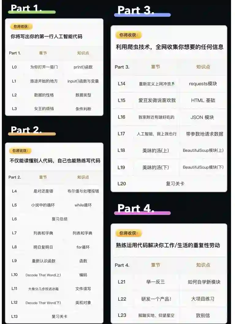 这个Python 小课设计的也是很合理的,它分为三个部分。