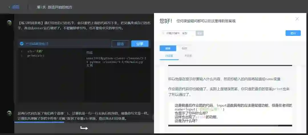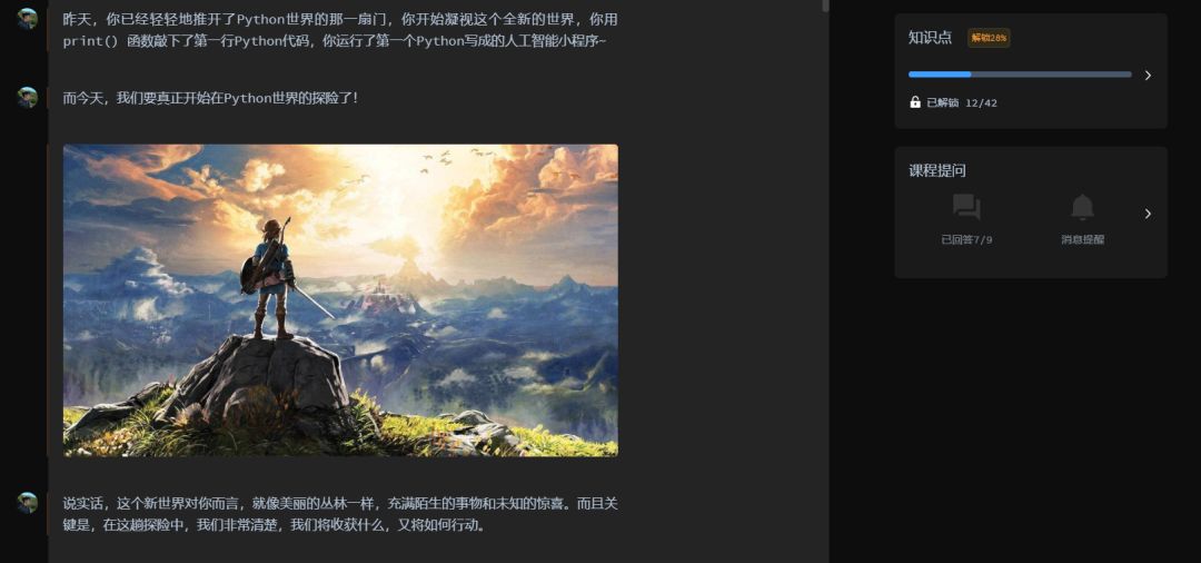 而 Python小课 把这样的问题完全避免了,进入课程界面,更像是一个「闯关游戏」,一个「Enter」键显示下一条内容,完全跟随自己的进度来。