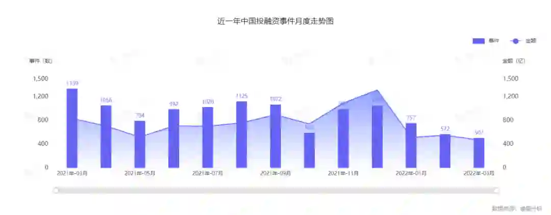 睿兽分析监测显示,自2021年12月至2022年3月中国一级市场投融资金额呈下降趋势。
