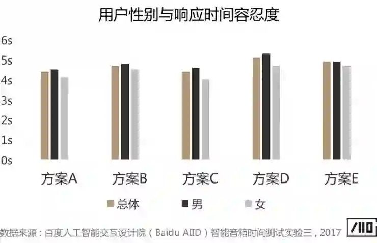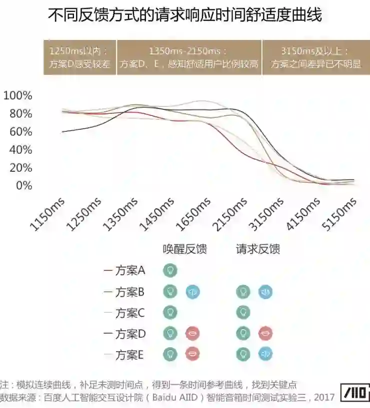 2)1350ms到2150ms,方案D、E感知舒适的用户比例较高,加入人声/音效后,如方案D的语音应答“好的”,有助于缓解用户延迟感受,提升速度感知体验。