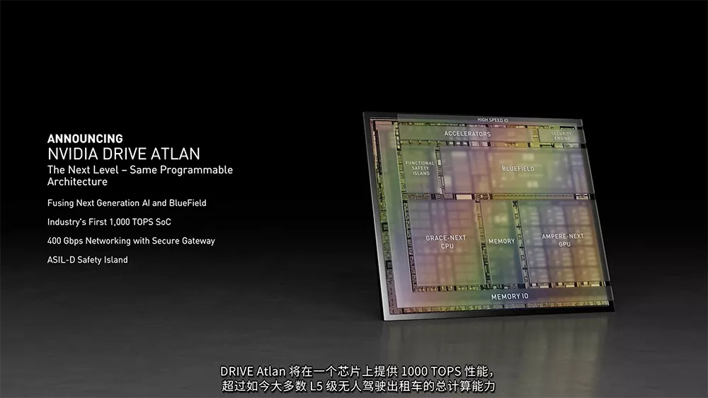 与此同时,黄仁勋宣布了NVIDIA新一代车载系统级芯片NVIDIA DRIVE Atlan,为汽车带来真正的数据中心。