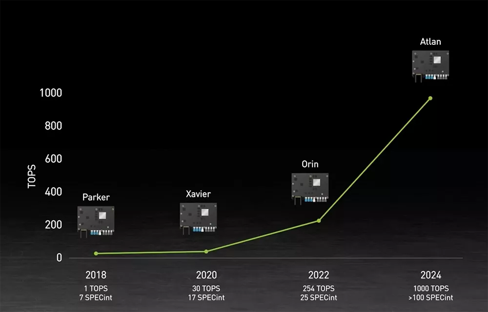 NVIDIA DRIVE Orin - 2019年年底公布但至今没有出货的芯片方案算力254 TOPS;2020年的Xavier方案有30 TOPS,而2018年的Parker仅可以提供1 TOPS。