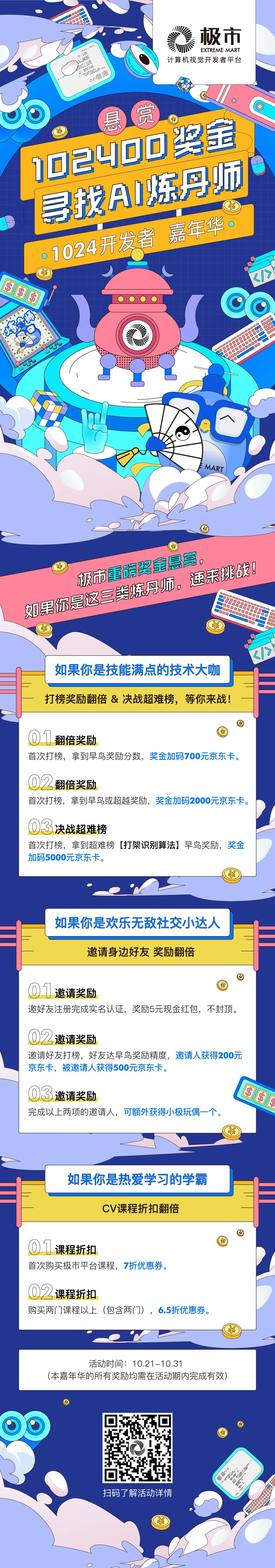1024活动期间报名极市算法打榜(任意榜),达到早鸟分数最少可获得10倍京东卡奖励(常规额外奖励200元京东卡),最高可获得25倍京东卡奖励。