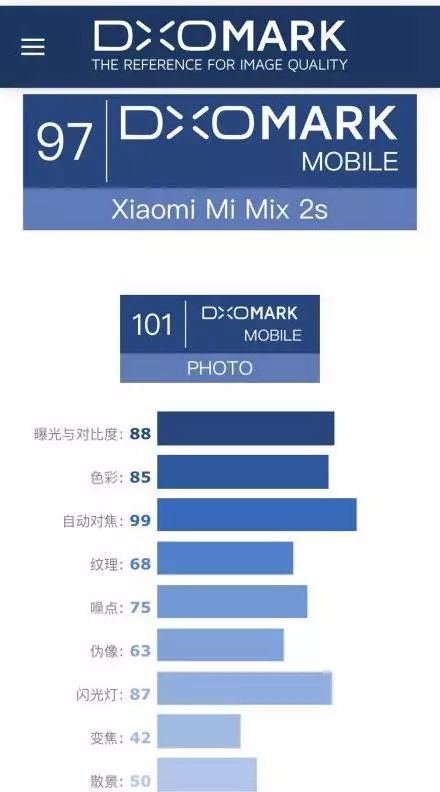 在这个评测标准下,Mix 2s 得到了 101 分的高分,雷军也表示这是有史以来拍照最好的小米手机,能和 iPhone X 并驾齐驱。要注意的是,这个 101 分是指静态照片单项,这一数据和 iPhone X 持平,视频方面拿到了 88 分,总分为 97 分,98分 的三星 S9 依然占据了头名。