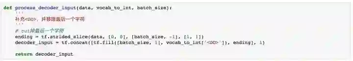 我们此时只看右边的Decoder端,可以看到我们的target序列是[<go>, W, X, Y, Z, <eos>],其中<go>,W,X,Y,Z是每个时间序列上输入给RNN的内容,我们发现,<eos>并没有作为输入传递给RNN。因此我们需要将target中的最后一个字符去掉,同时还需要在前面添加<go>标识,告诉模型这代表一个句子的开始。