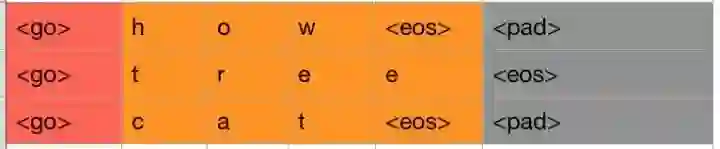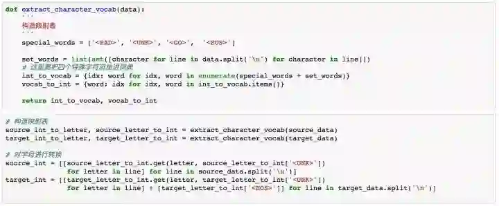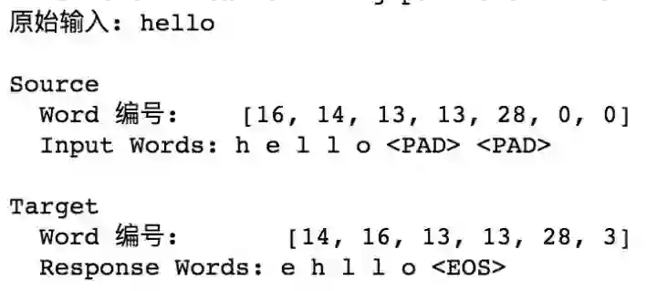 在神经网络中,对于文本的数据预处理无非是将文本转化为模型可理解的数字,这里都比较熟悉,不作过多解释。但在这里我们需要加入以下四种字符,<PAD>主要用来进行字符补全,<EOS>和<GO>都是用在Decoder端的序列中,告诉解码器句子的起始与结束,<UNK>则用来替代一些未出现过的词或者低频词。