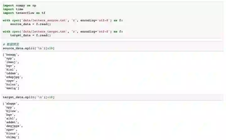 我们先把source和target数据加载进来,可以看一下前10行,target的每一行是对source源数据中的单词进行了排序。下面我们就将基于这些数据来训练一个Seq2Seq模型,来帮助大家理解基础架构。