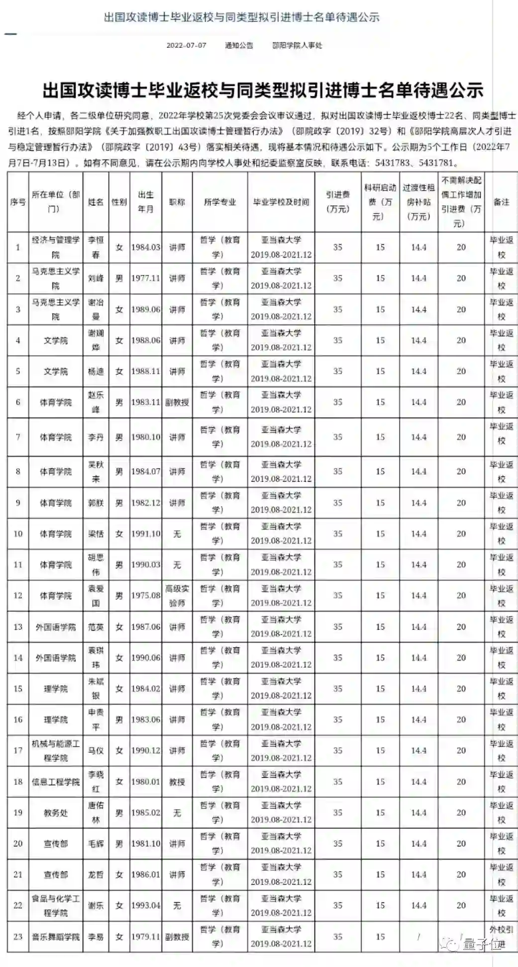 2022年7月7日,湖南省邵阳学院在学校官方主页上,发布了一个名为《出国攻读博士毕业返校与同类型拟引进博士名单待遇公示》的公告。