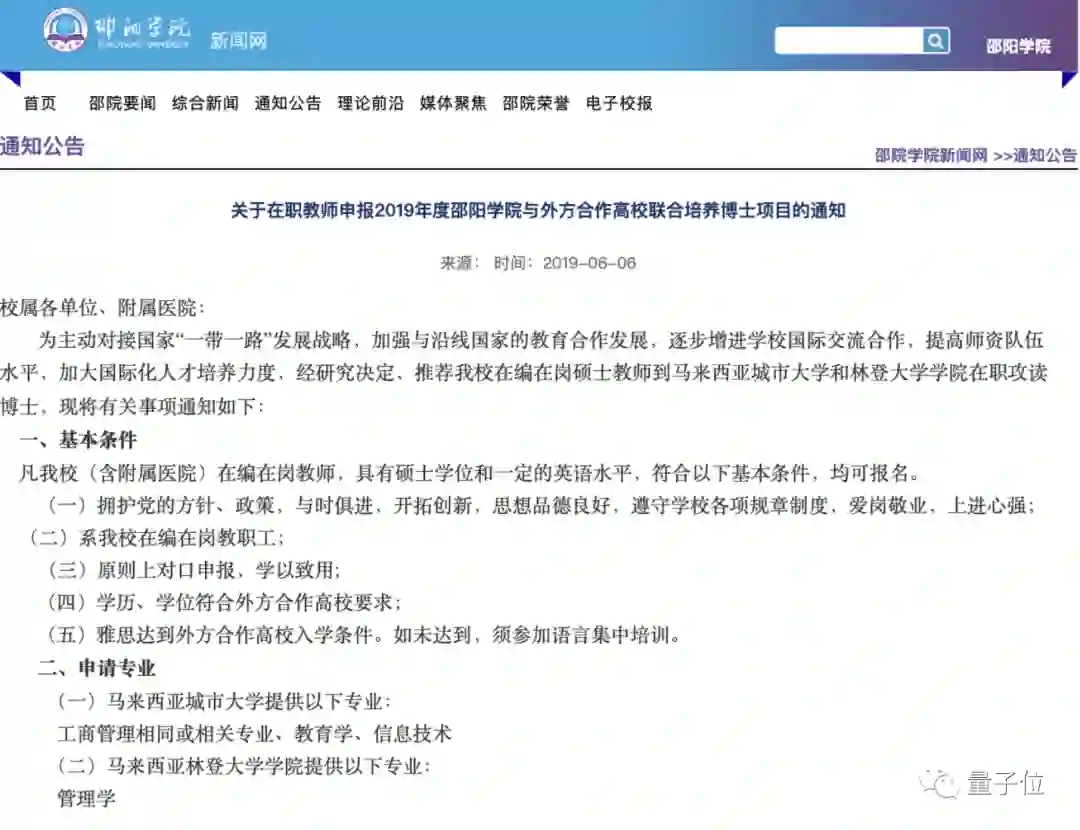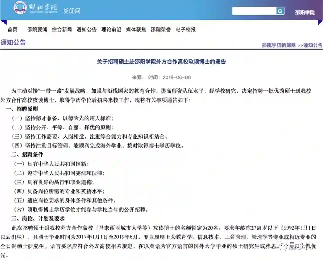 事实上,邵阳学院在2019年,确实也有过招聘硕士赴东南亚高校读博的通告,只不过当时是在马来西亚。