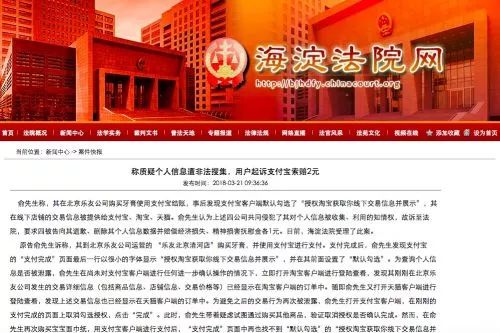 【TechWeb报道】3月21日消息,据海淀法院官网消息,俞先生称,其在北 京乐友公司购买牙膏使用支付宝结账,事后发现支付宝客户端默认勾选了“授权淘宝获取你线下交易信息并展示”,其在线下店铺的交易信息被提供给支付宝、淘 宝、天猫。